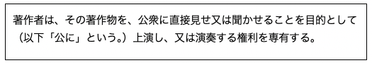 つまり、「公衆」に聞かせることを目的として、音楽を「演奏」するには、著作者(著作権者)の許諾が必要になります。著作権の支分権のひとつである「演奏権」が働くわけです。