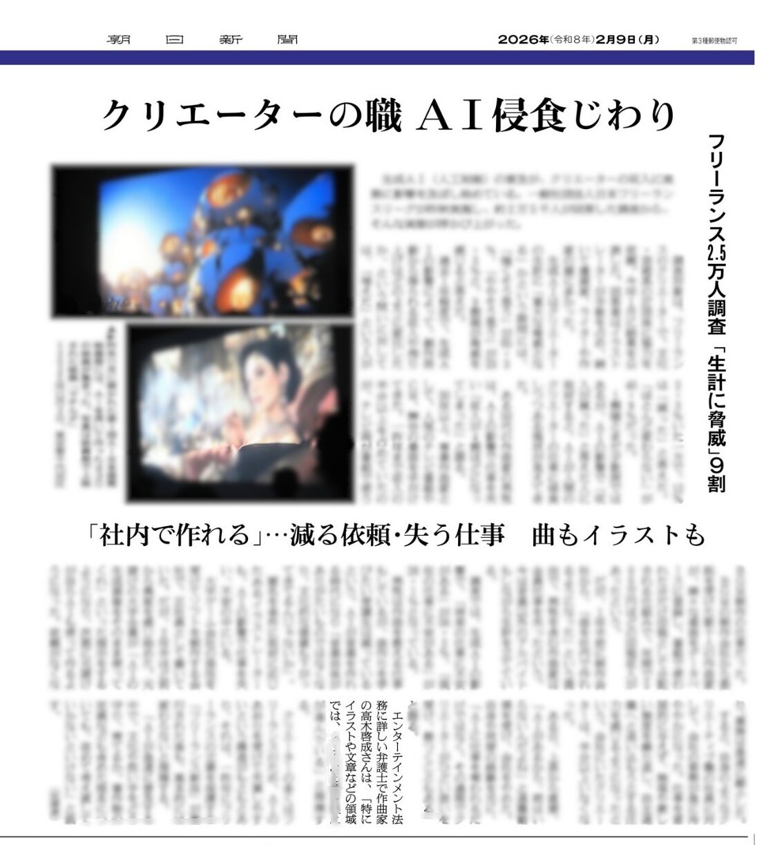 2026.02.09 メディア 朝日新聞で生成AIの制作現場への影響についてコメントしました 高木啓成弁護士が、朝日新聞の取材を受け、イラストやライターの現場への生成AIの影響についてコメントしました(2月9日朝刊)。