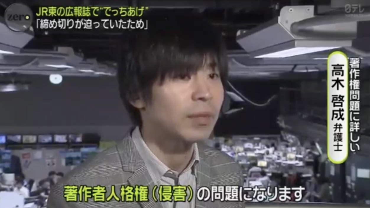 2019.07.29 メディア 日本テレビ「NEWS ZERO」に出演しました 高木啓成弁護士が、日本テレビのニュース番組「NEWS ZERO」に出演し、JR東日本の広報誌「JR EAST」の不正記事に関し、著作権法上の問題点について解説しました。 Screenshot
